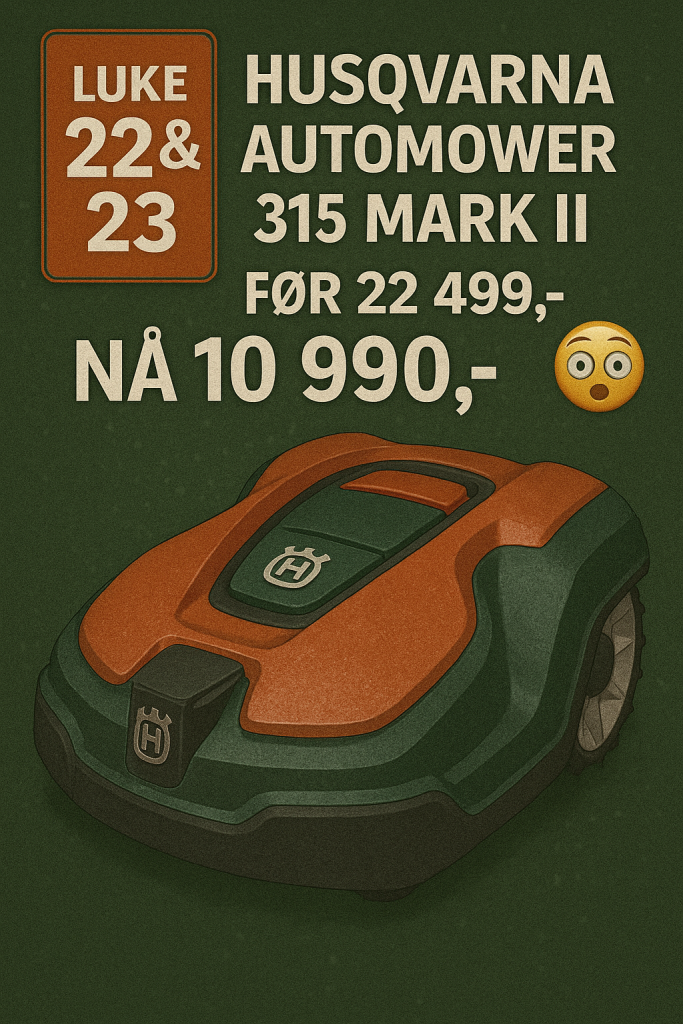 Luke 22 & 23: Husqvarna Automower 315 Mark II – før 22 499,- nå 10 990,- 🤯 Husqvarna Automower 315 Mark II er en smart robotgressklipper for plener opptil 1500 m². Den kompakte 4-hjulsdesignen takler skråninger på opptil 40 %, smale passasjer og ujevnt terreng, og den finner selv raskeste vei tilbake til ladestasjonen med trippelsøk-funksjon. Klipperen har frostvakt og…
