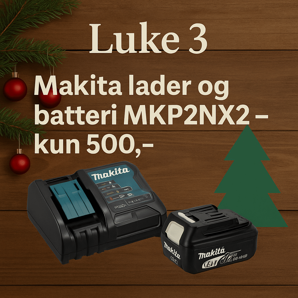 Luke 3: Makita lader- og batteripakke MKP2NX2 – kun 500,- 🎄