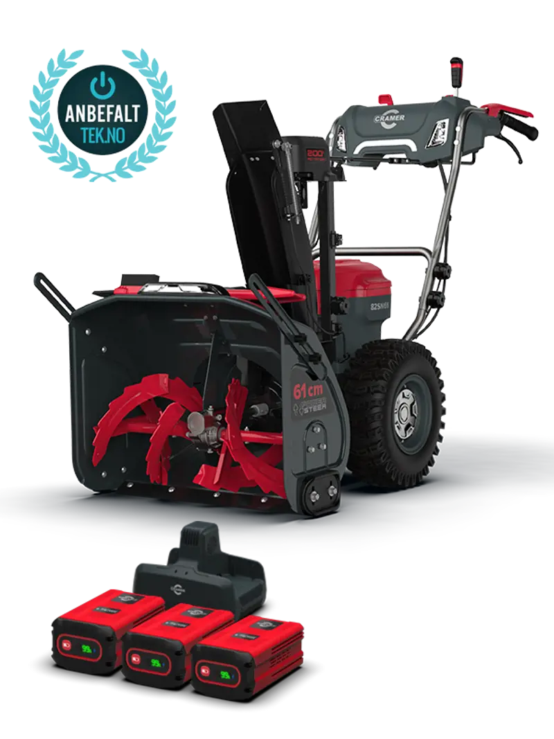 Cramer 82SN61 snøfreser drives av et fleksibelt batterisystem som er kompatibelt med alle Cramer 82V produkter. Dette gjør at du kan bruke det samme batteriet på tvers av forskjellige verktøy, noe som gir en kostnadseffektiv og praktisk løsning for hagearbeidet. Med plug-and-play-funksjonalitet trenger du ikke å bekymre deg for drivstoff eller olje, noe som gjør oppstart og vedlikehold til en lek. Den har sterke dekk med dype spor som gir godt grep og stabilitet under snørydding. De to uavhengige hubmotorene gir presis manøvrering og enkel håndtering, slik at du kan navigere rundt hindringer med letthet. Styreclutcher gir enkel justering av utkastretningen, mens antispinnfunksjonen forhindrer at hjulene sklir og sikrer jevn fremdrift. De ultrasterke LED-lysene gir optimal sikt, selv i dårlig lysforhold, slik at du kan arbeide trygt og effektivt, selv på de mørkeste vinterdagene. Cramer 82SN61 snøfreser kan brukes med 2 eller 3 batterier, og ved bruk av 3 batterier maksimerer den effektivt energien for å takle selv de mest krevende snøforholdene. Samtidig er den imponerende stillegående – opptil 20 ganger mer stillegående enn tradisjonelle bensindrevne alternativer, noe som gjør den ideell for støyfølsomme områder. Cramer 82SN61 snøfreser er bygget for å vare. Med en robust konstruksjon, inkludert et solid stålchassis, herdet innmaterskrue og en pålitelig magnesiumgirkasse, tåler denne snøfreseren de tøffeste værforholdene. Den har også et integrert batteristyringssystem som beskytter mot overbelastning og overoppheting, noe som bidrar til å sikre en trygg og pålitelig drift.