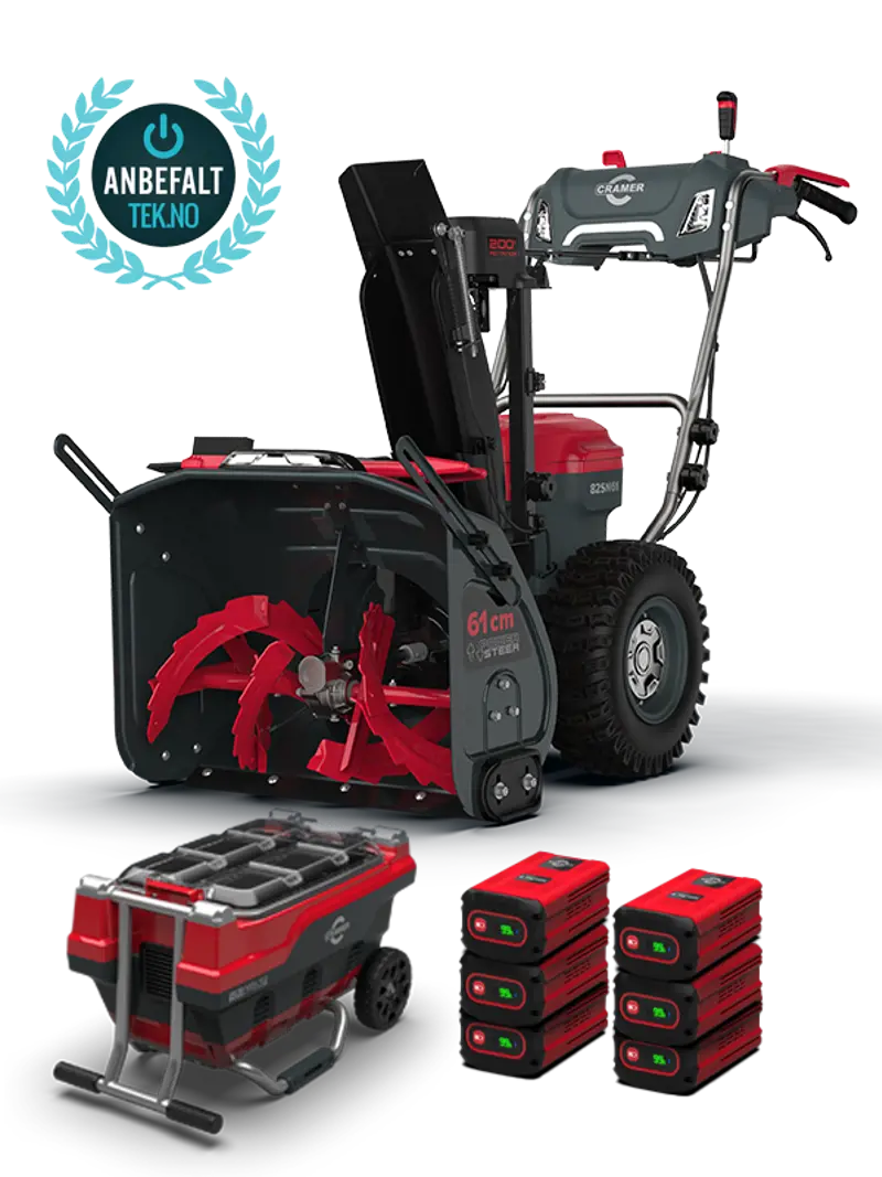 Cramer 82SN61 snøfreser drives av et fleksibelt batterisystem som er kompatibelt med alle Cramer 82V produkter. Dette gjør at du kan bruke det samme batteriet på tvers av forskjellige verktøy, noe som gir en kostnadseffektiv og praktisk løsning for hagearbeidet. Med plug-and-play-funksjonalitet trenger du ikke å bekymre deg for drivstoff eller olje, noe som gjør oppstart og vedlikehold til en lek. Den har sterke dekk med dype spor som gir godt grep og stabilitet under snørydding. De to uavhengige hubmotorene gir presis manøvrering og enkel håndtering, slik at du kan navigere rundt hindringer med letthet. Styreclutcher gir enkel justering av utkastretningen, mens antispinnfunksjonen forhindrer at hjulene sklir og sikrer jevn fremdrift. De ultrasterke LED-lysene gir optimal sikt, selv i dårlig lysforhold, slik at du kan arbeide trygt og effektivt, selv på de mørkeste vinterdagene. Cramer 82SN61 snøfreser kan brukes med 2 eller 3 batterier, og ved bruk av 3 batterier maksimerer den effektivt energien for å takle selv de mest krevende snøforholdene. Samtidig er den imponerende stillegående – opptil 20 ganger mer stillegående enn tradisjonelle bensindrevne alternativer, noe som gjør den ideell for støyfølsomme områder. Cramer 82SN61 snøfreser er bygget for å vare. Med en robust konstruksjon, inkludert et solid stålchassis, herdet innmaterskrue og en pålitelig magnesiumgirkasse, tåler denne snøfreseren de tøffeste værforholdene. Den har også et integrert batteristyringssystem som beskytter mot overbelastning og overoppheting, noe som bidrar til å sikre en trygg og pålitelig drift.