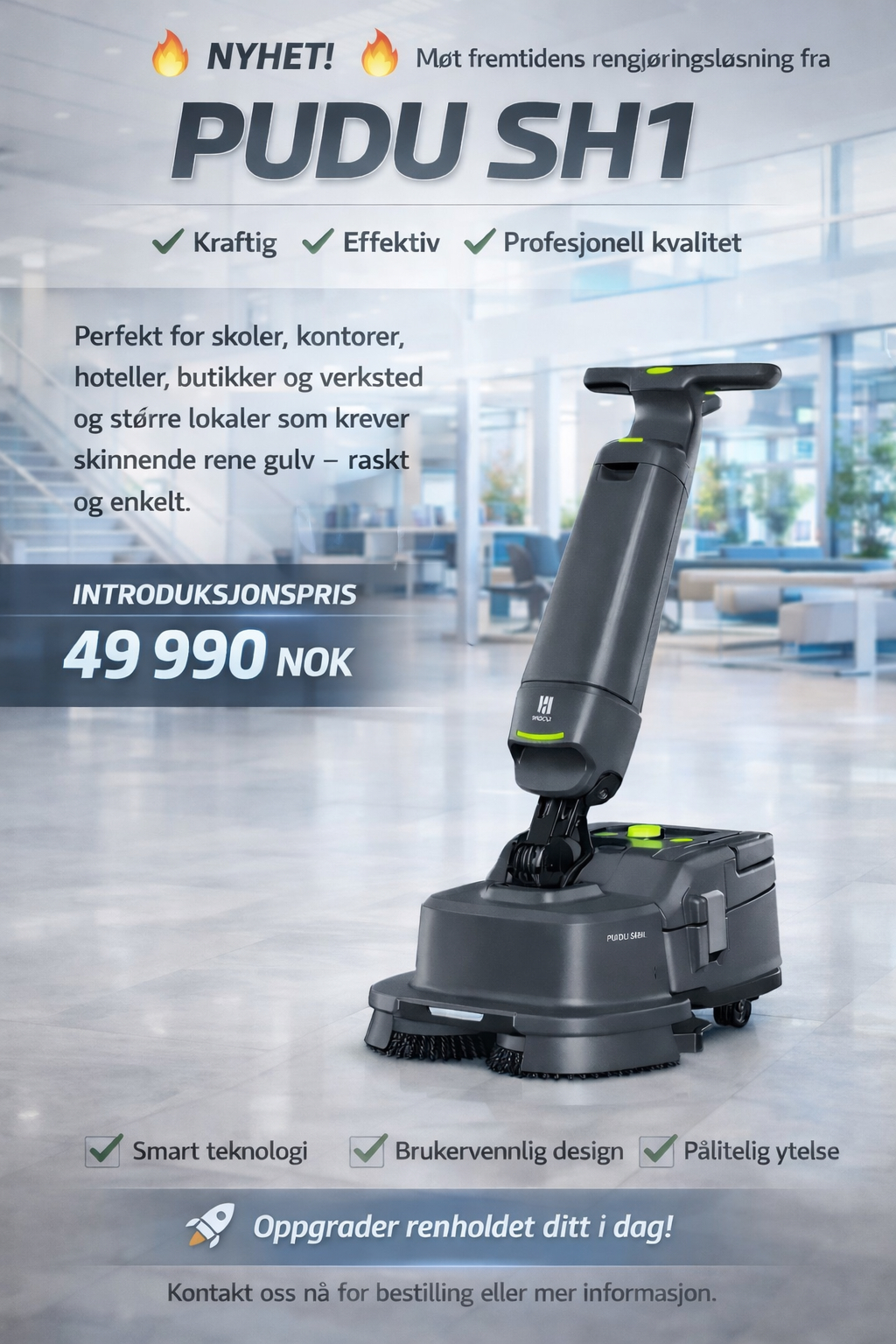 Vi har én PUDU SH1 i butikken som du kan prøve; kom innom for en demo og se forskjellen på gulvet med én gang!